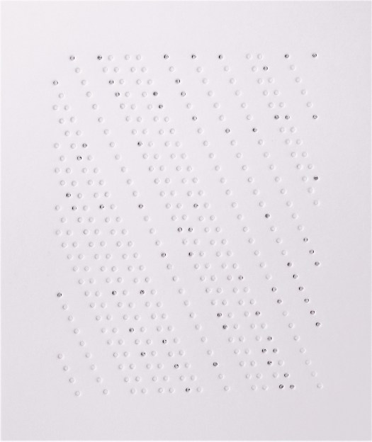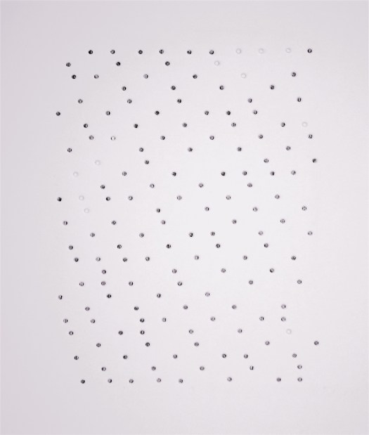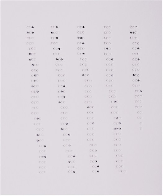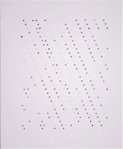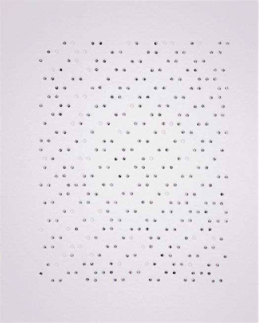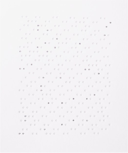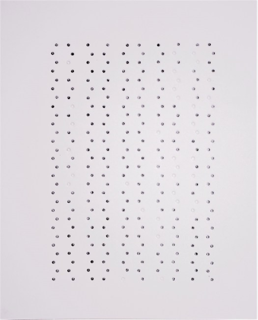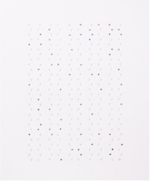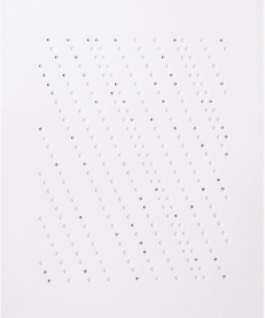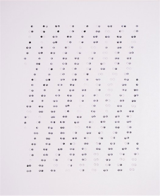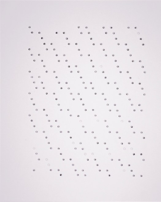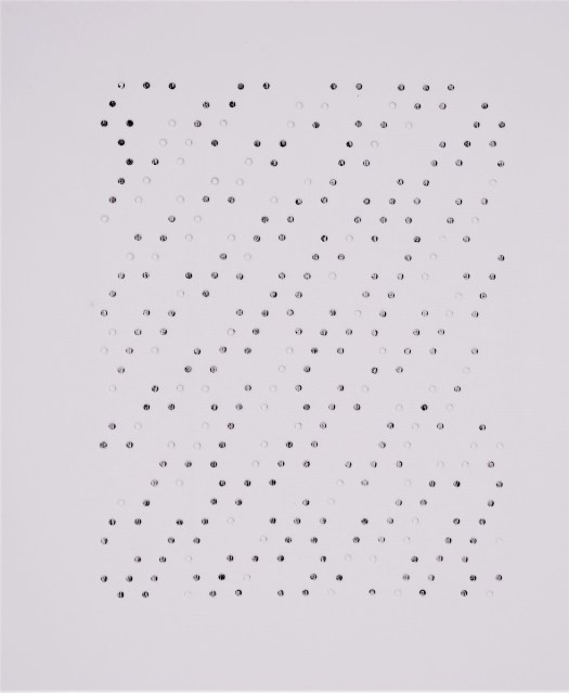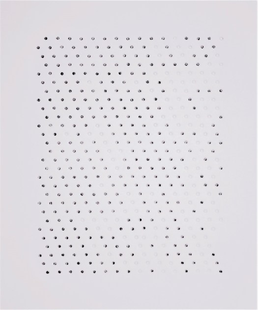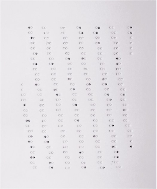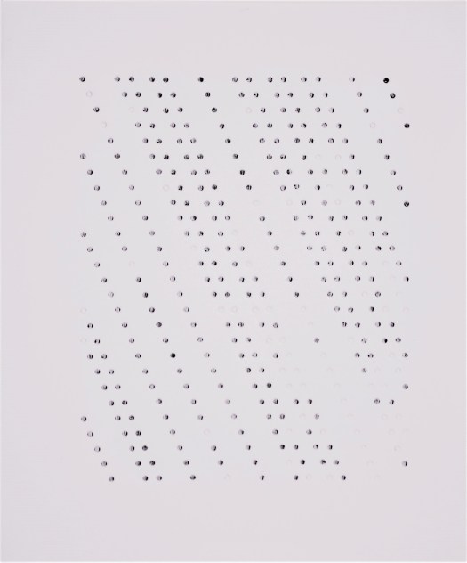 Formally, the work becomes increasingly generative and meticulous, originating from a minimal unit—a point, a zero, a perforation—from which the surface is activated. This act of “piercing” is not merely material, but temporal: an insistence on a continuous present that resonates with the logic of code and repetition.
