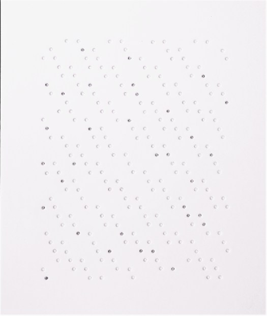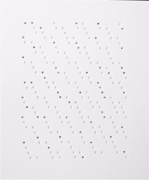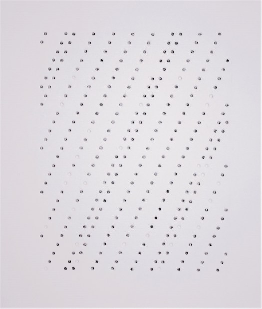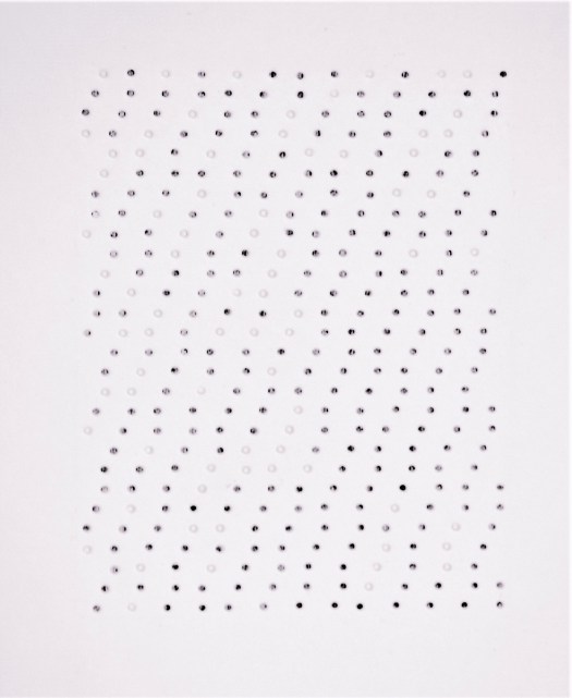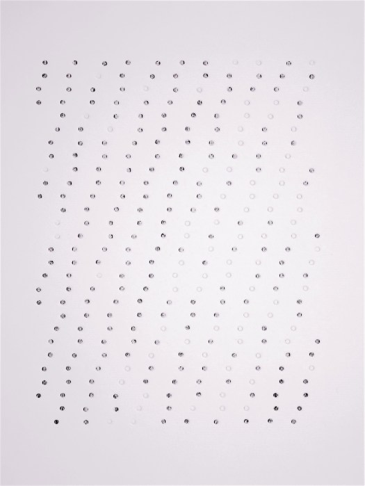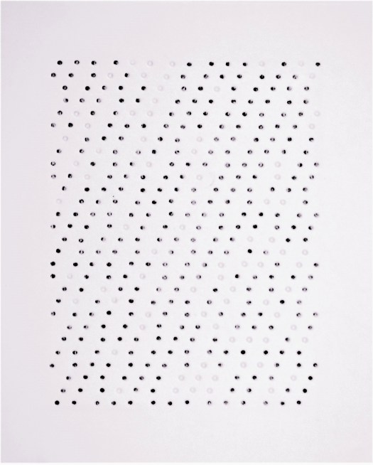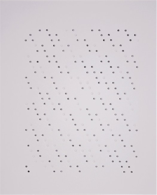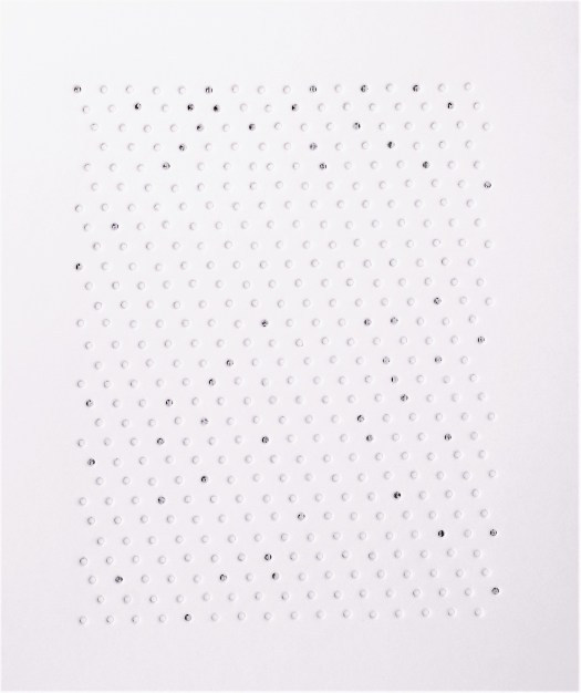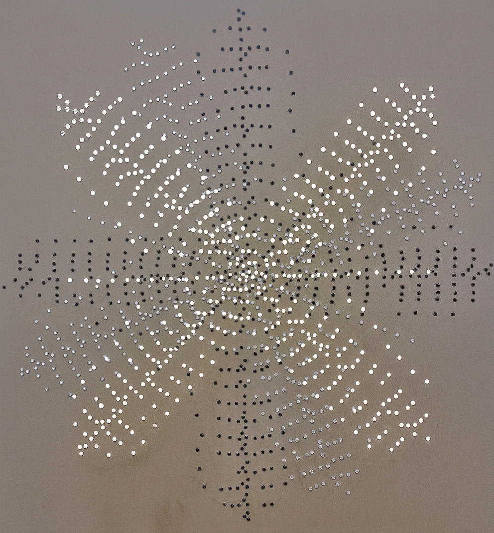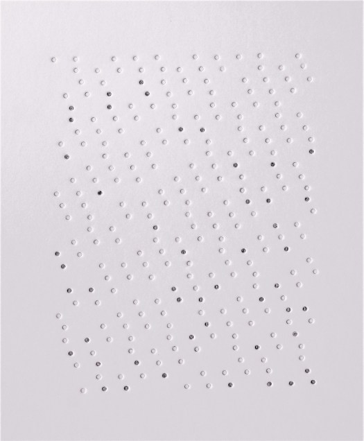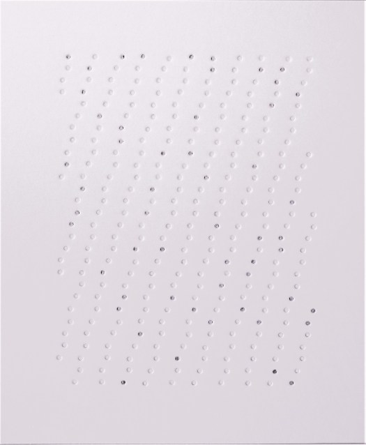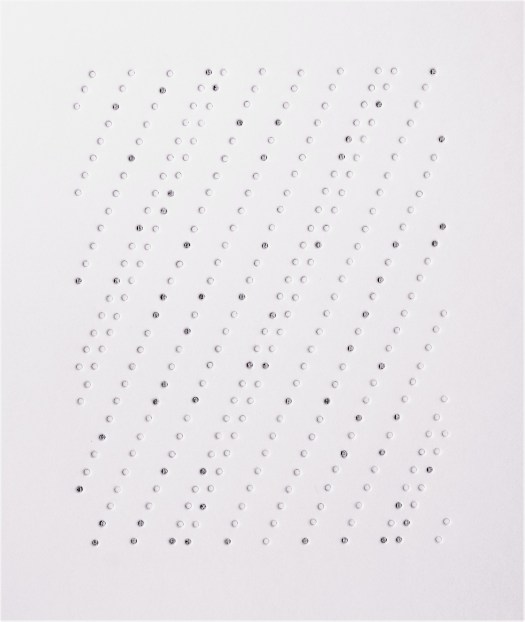 Formally, the work becomes increasingly generative and meticulous, originating from a minimal unit—a point, a zero, a perforation—from which the surface is activated. This act of “piercing” is not merely material, but temporal: an insistence on a continuous present that resonates with the logic of code and repetition.