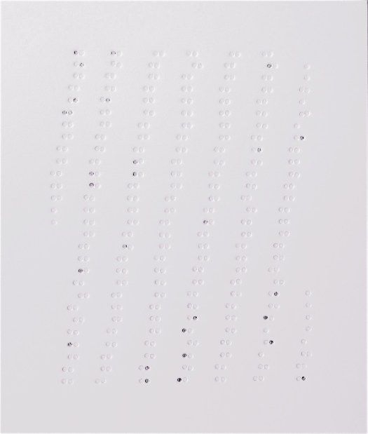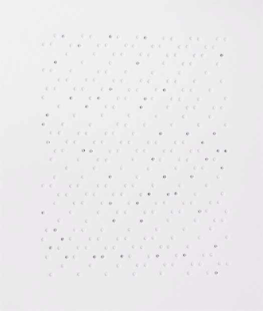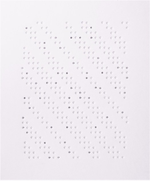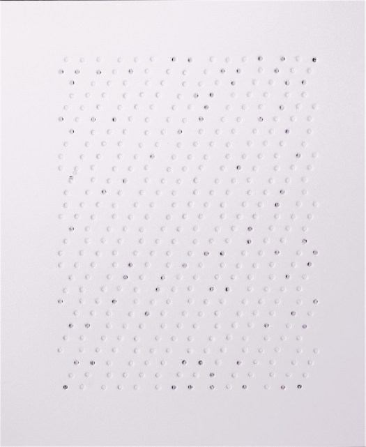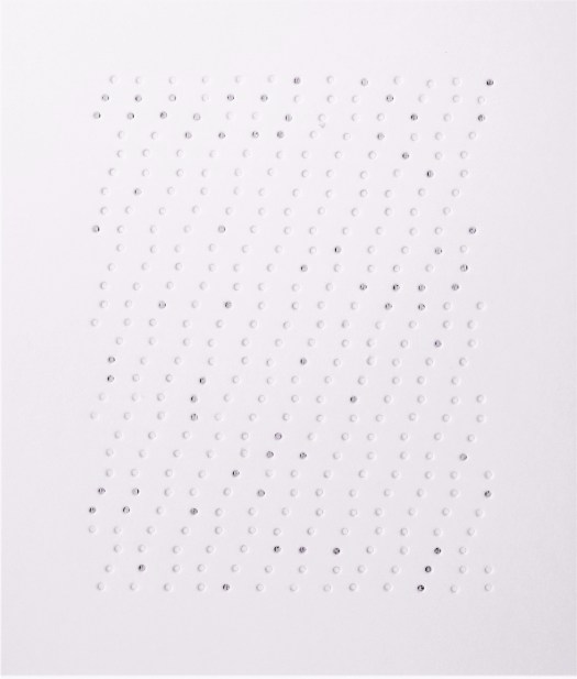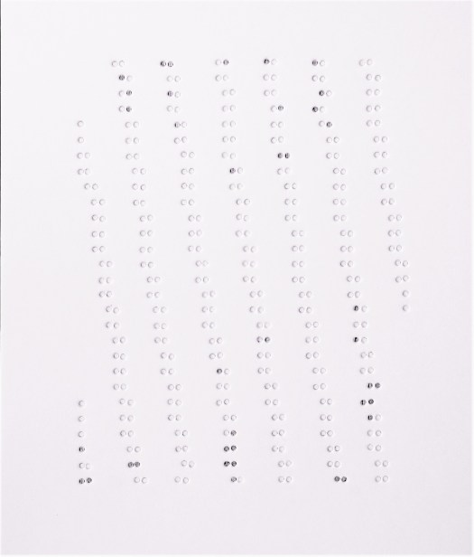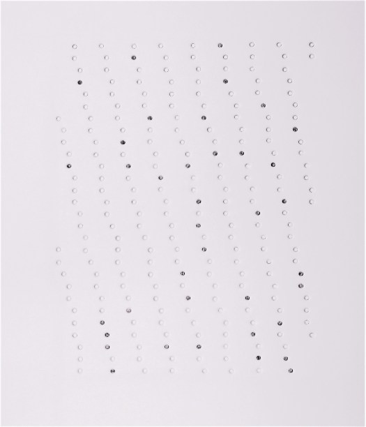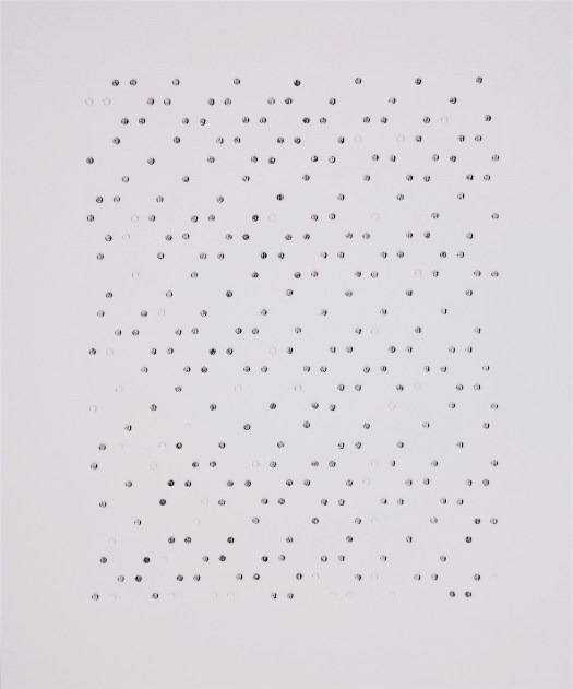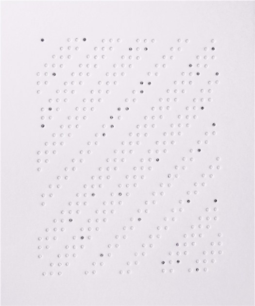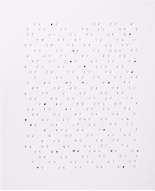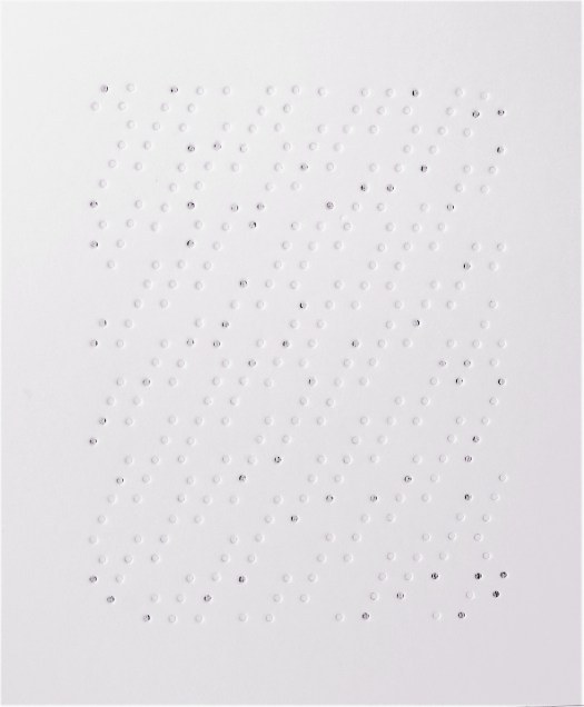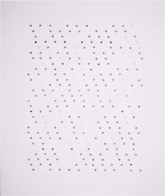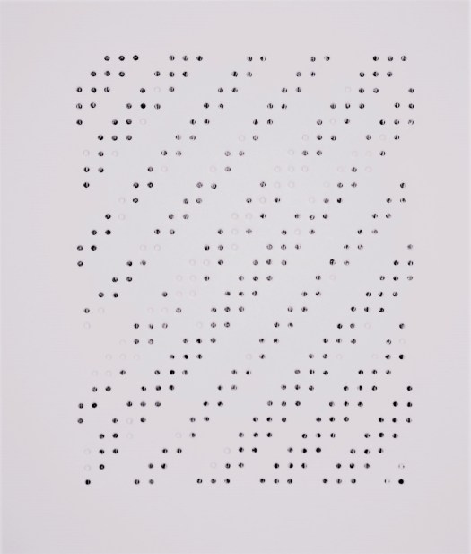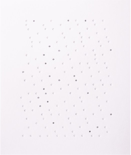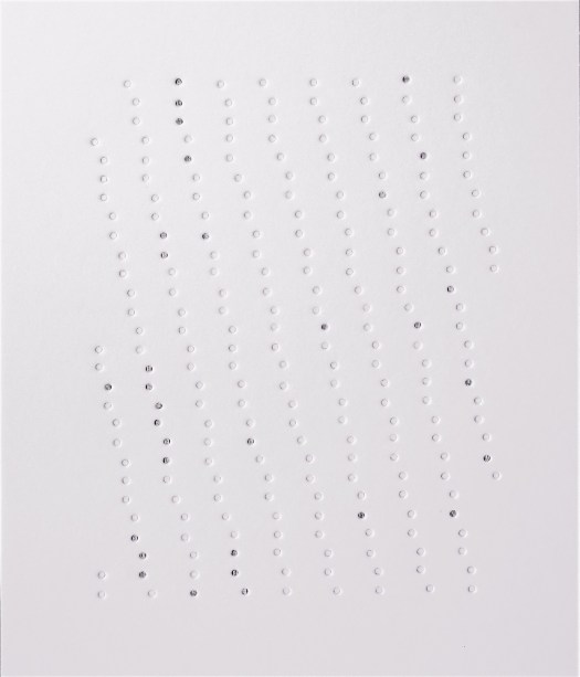 Formally, the work becomes increasingly generative and meticulous, originating from a minimal unit—a point, a zero, a perforation—from which the surface is activated. This act of “piercing” is not merely material, but temporal: an insistence on a continuous present that resonates with the logic of code and repetition.