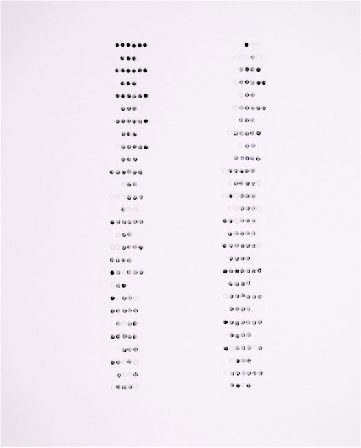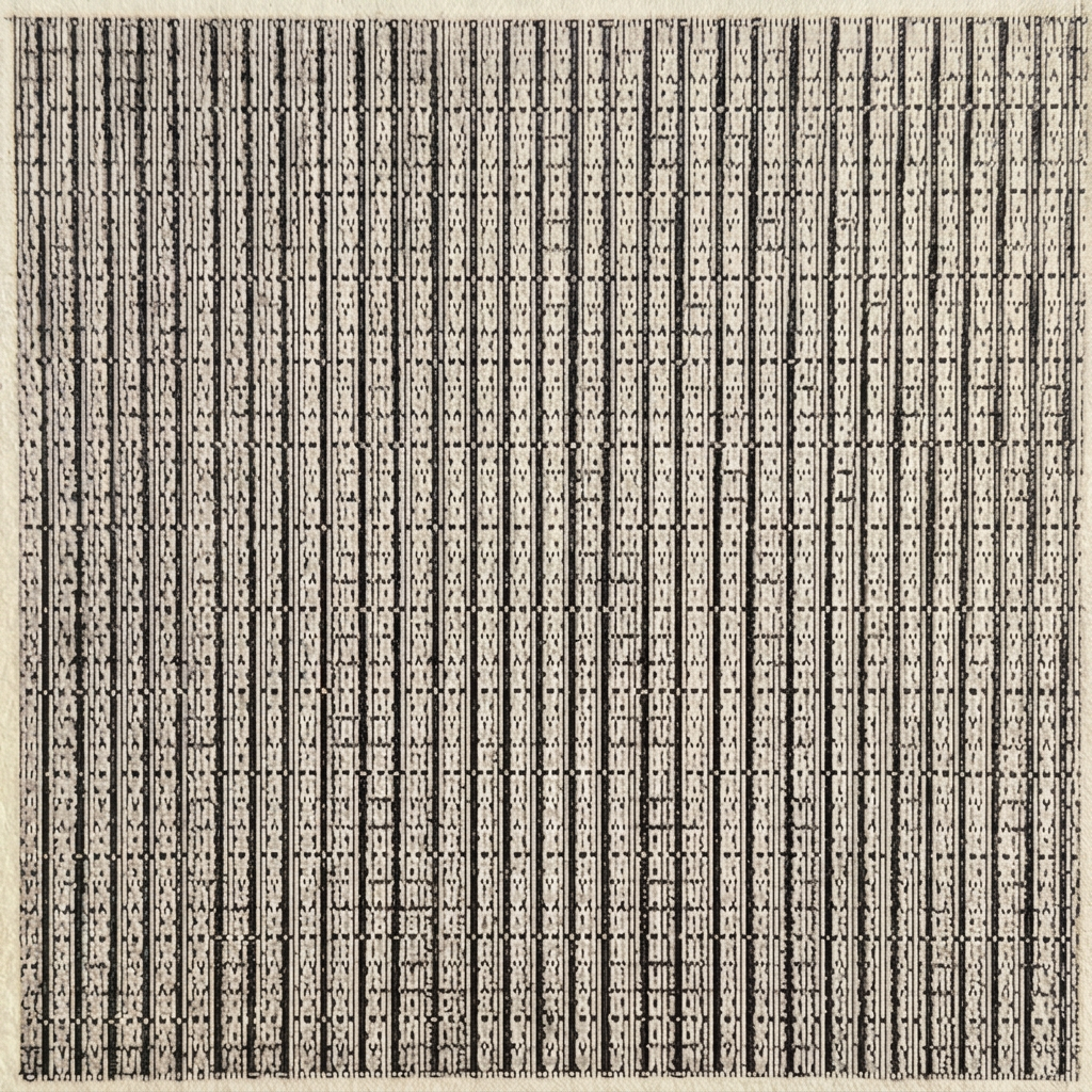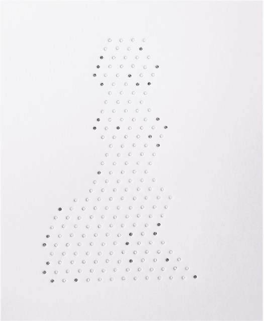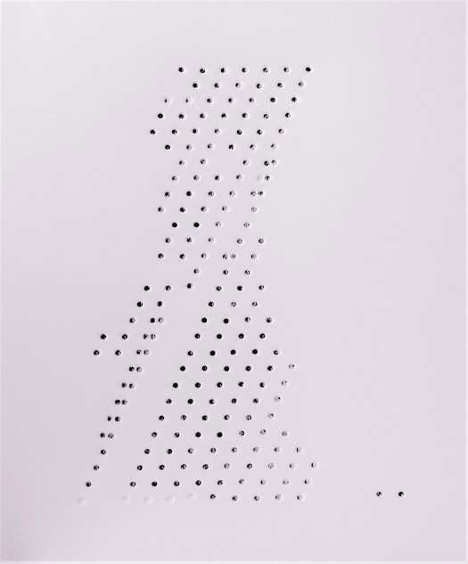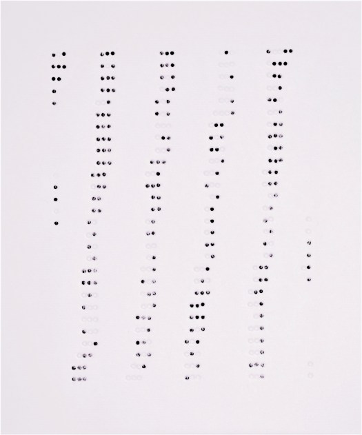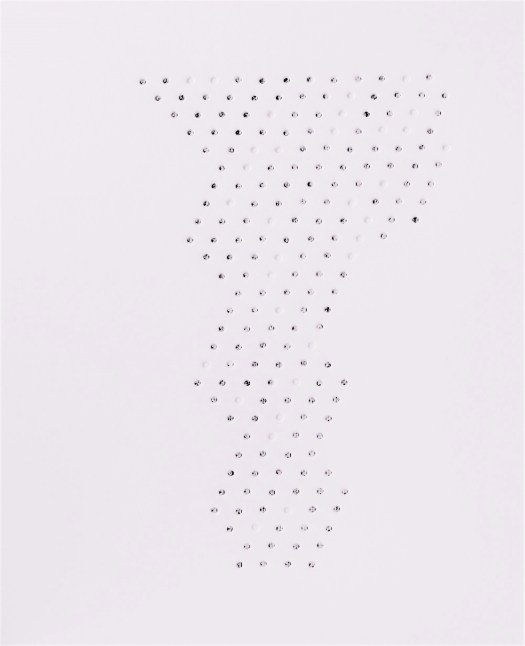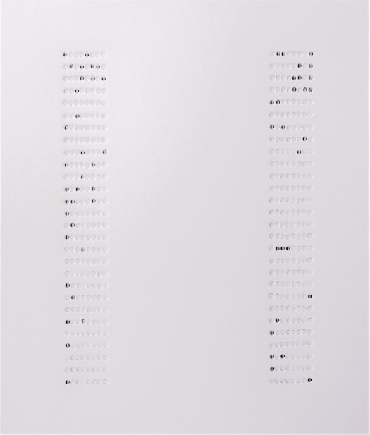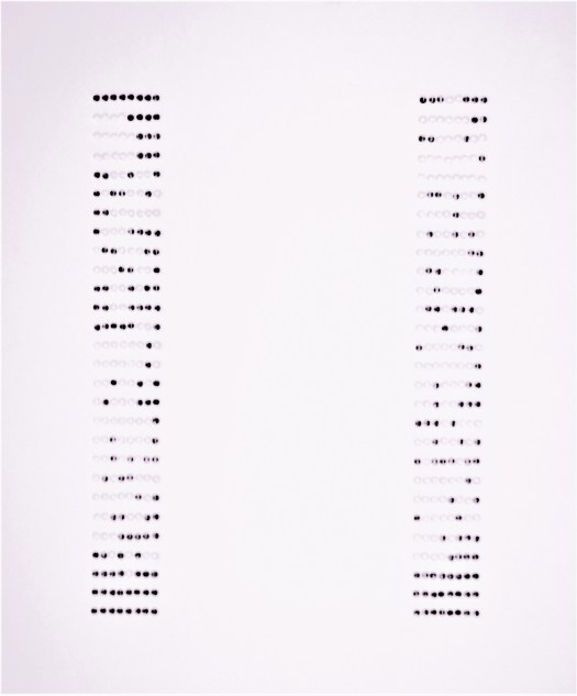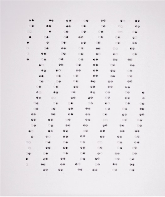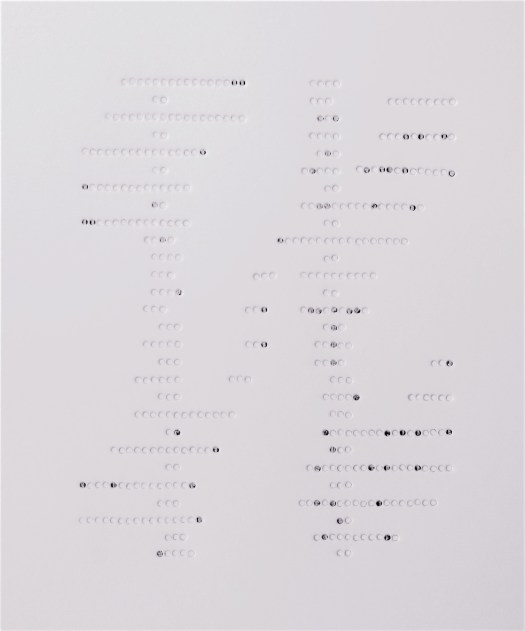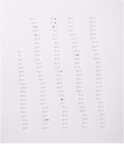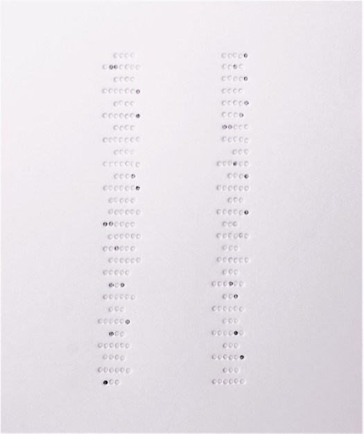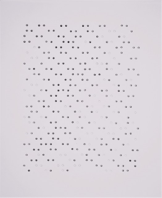 Formally, the work becomes increasingly generative and meticulous, originating from a minimal unit—a point, a zero, a perforation—from which the surface is activated. This act of “piercing” is not merely material, but temporal: an insistence on a continuous present that resonates with the logic of code and repetition.