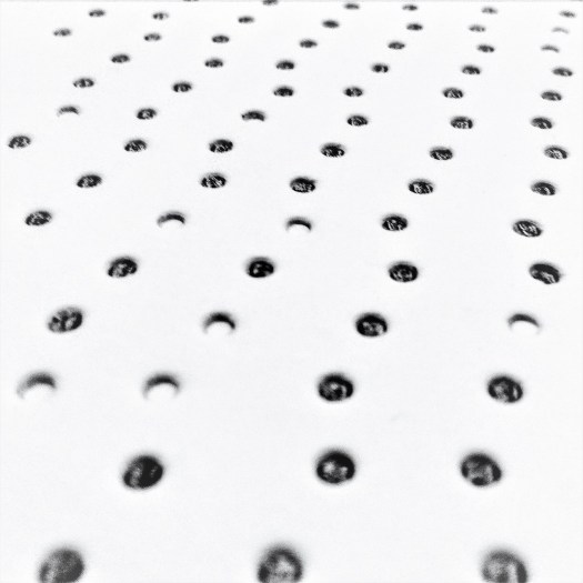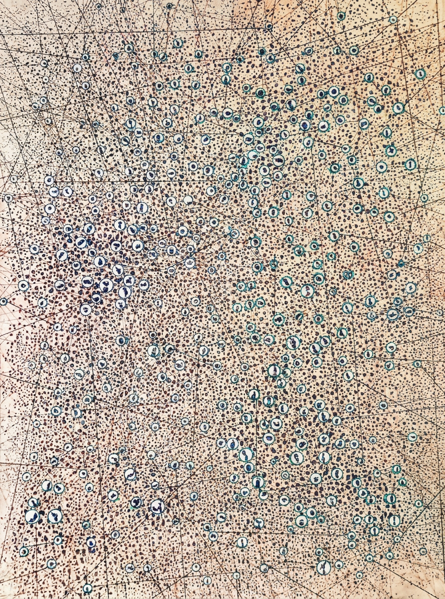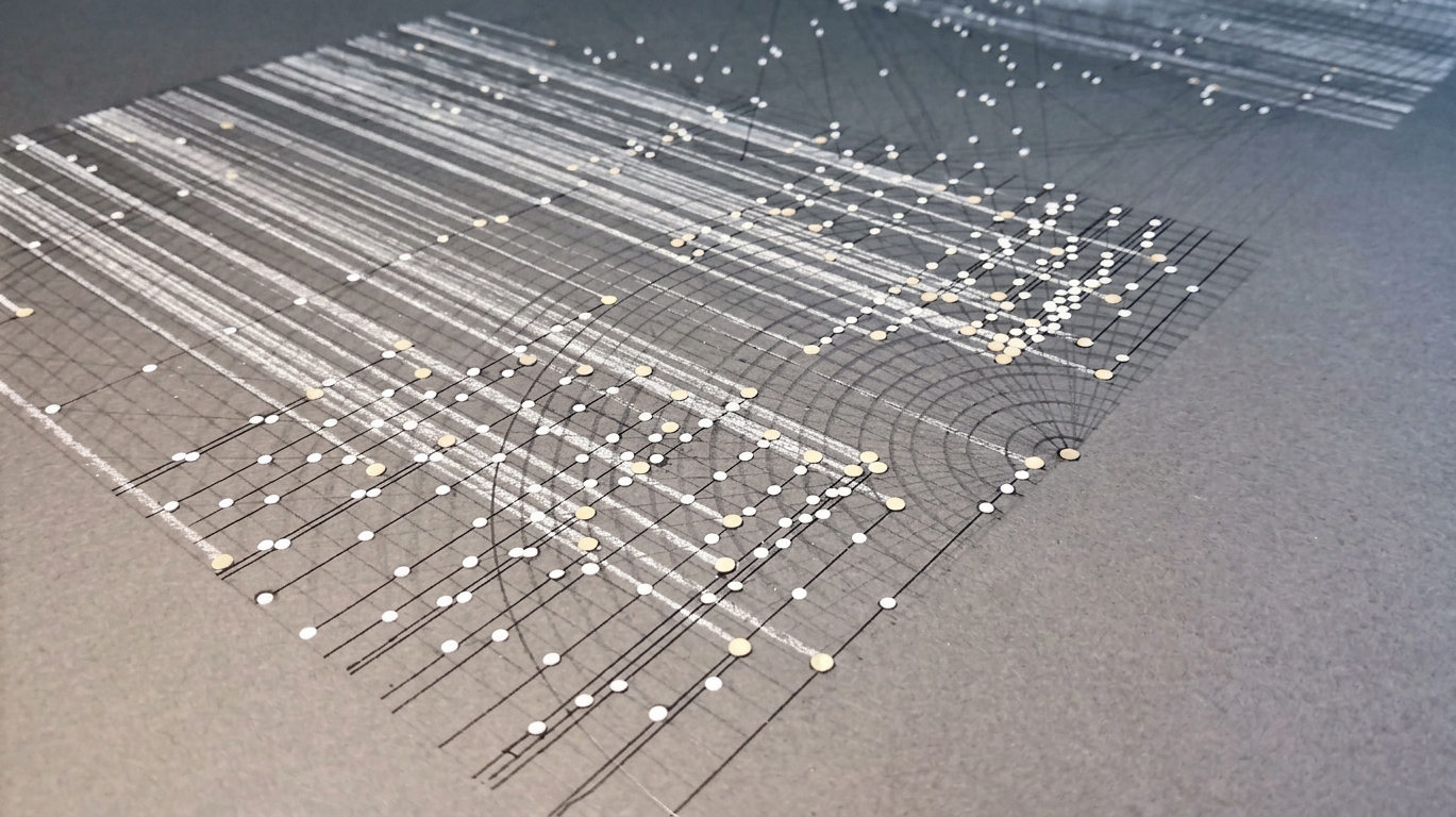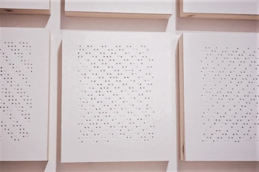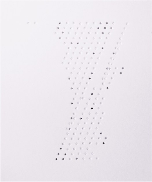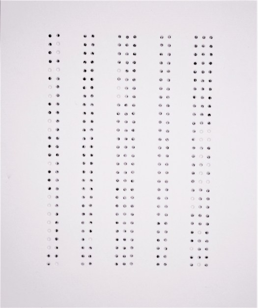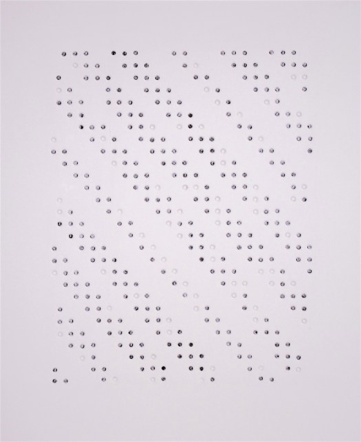 Formalmente, el trabajo se vuelve cada vez más generativo y minucioso, partiendo de una unidad mínima —un punto, un cero, una perforación— desde la cual se activa la superficie. Este gesto de “perforar” no es únicamente material, sino también temporal: una insistencia en un presente continuo que dialoga con la lógica del código y la repetición.
