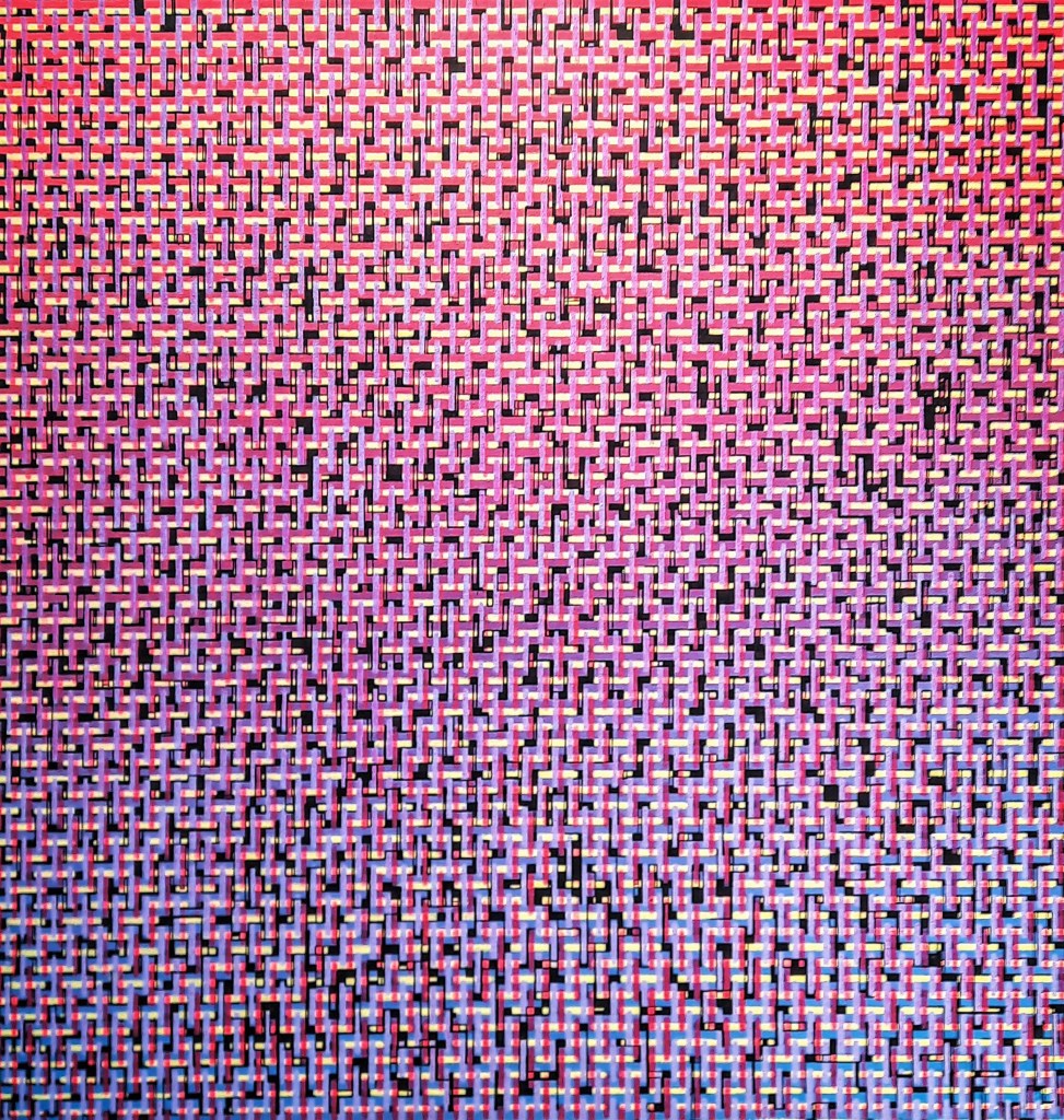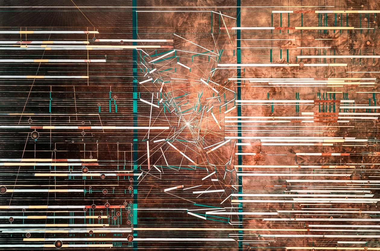 In this sense, the work does not describe the digital era; it constitutes it as a present condition—a space where techniques, languages, and innovations converge, tensioning the boundaries between the analog and the technological. From here, painting unfolds toward parameters such as frequency, angle, velocity, and length, understood not only as physical magnitudes but as perceptual structures.