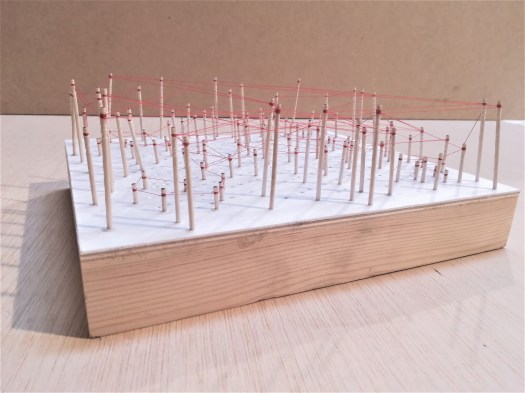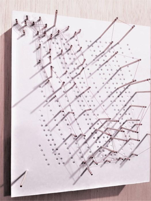 La herramienta se convierte así en un elemento clave, no solo como medio, sino como un dispositivo que permite explorar un tránsito de conectividad y transformación perceptiva. Las obras configuran retículas complejas de relaciones que reflejan desplazamientos —visuales, mentales, espaciales— y que, en su reiteración, rozan principios de orden metafísico vinculados al ser y al estar en relación con el entorno.