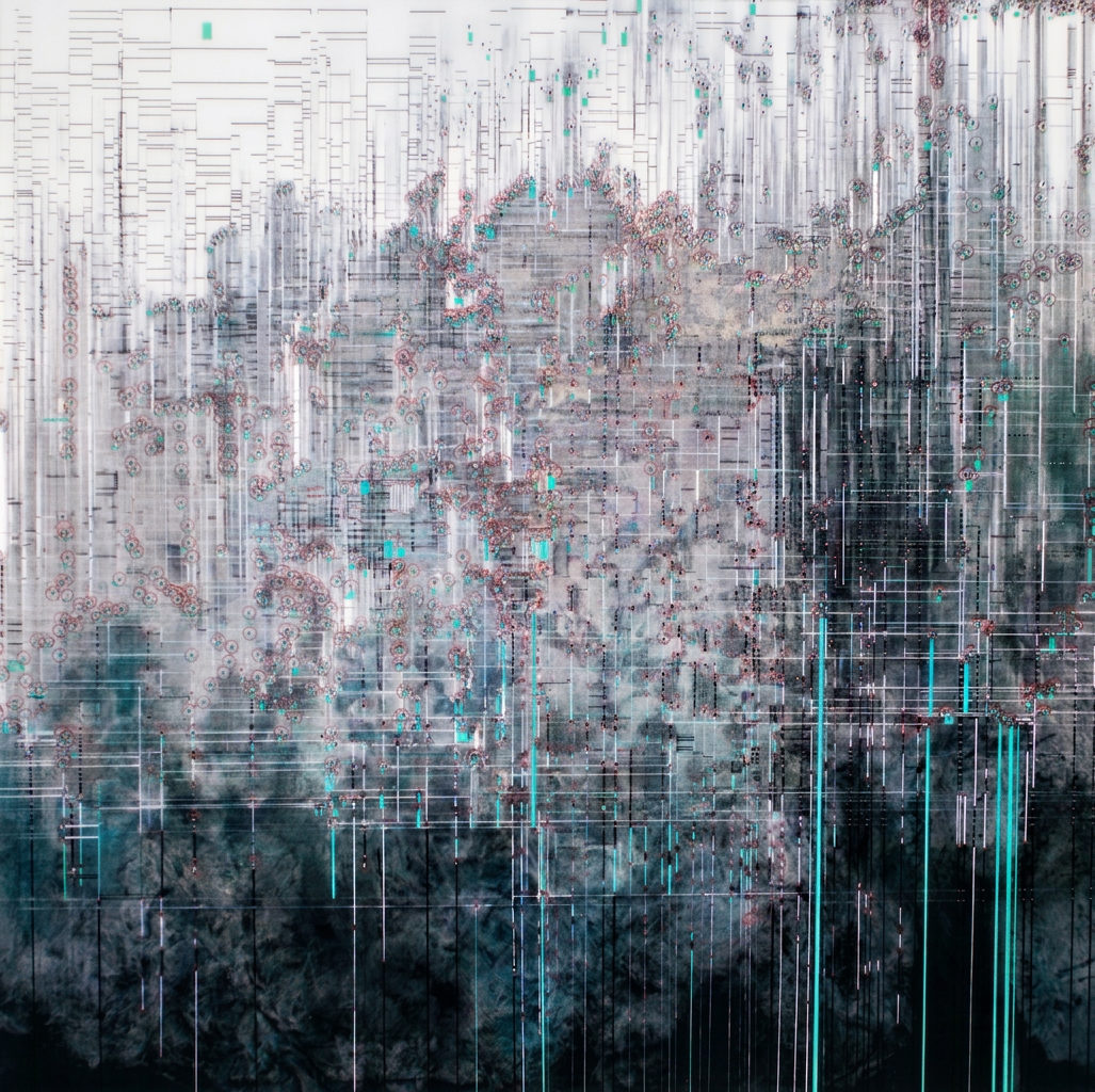 META X: Acrylic, oil, graphite and pigment with resin on canvas 200 × 200 cm, 2021.