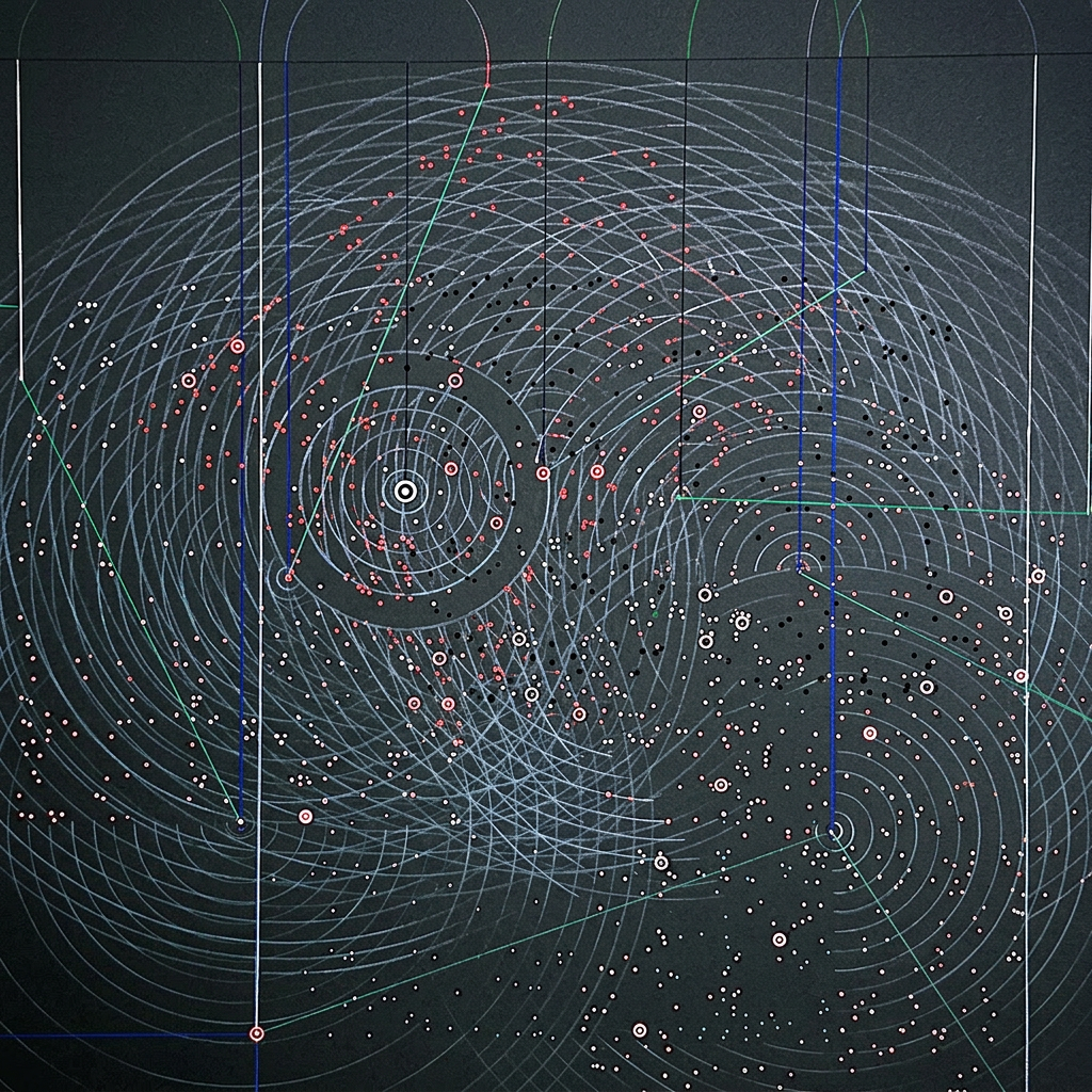 FOUR PERCENT EIGHTY DEGREES OF CARTOGRAPHIES OF THE VOIDS WITH ELECTROMAGNETIC RADIATIONS: Acrylic and lamp black pigment dispersed and bound with shellac on wood. 100 × 100 cm, 2020. Detail