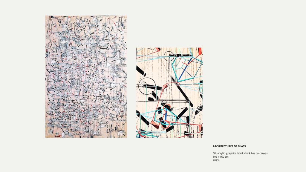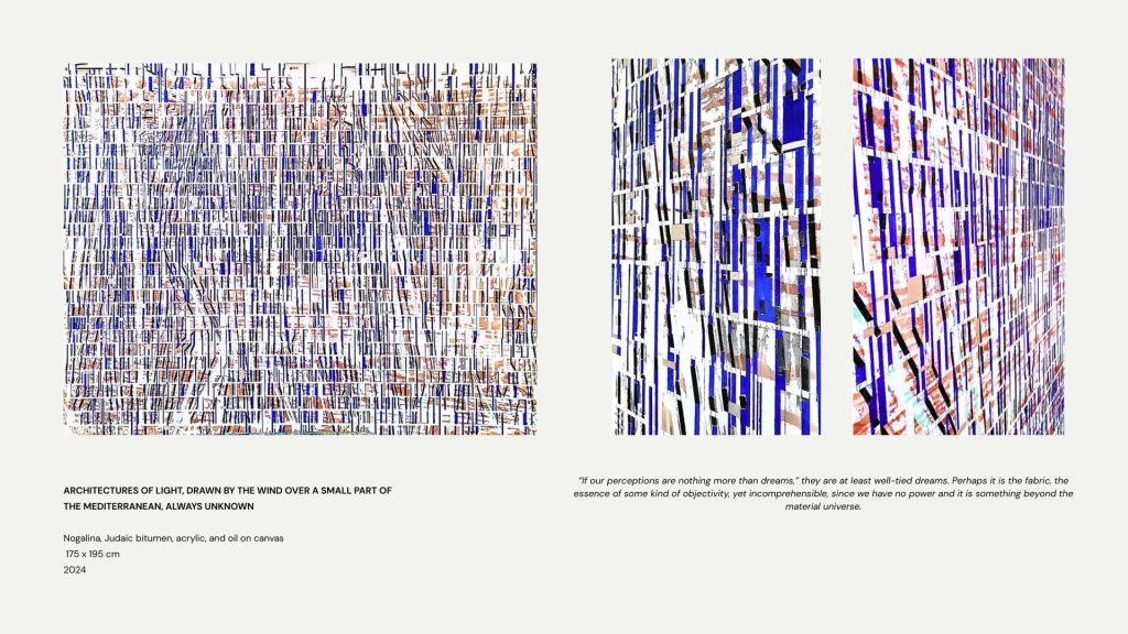 Su pintura no opera como representación, sino como modelo relacional. Cada superficie se construye como un campo de fuerzas en el que las estructuras visibles sugieren sistemas invisibles: redes, infraestructuras, flujos de energía y circulaciones de memoria. La retícula, los vectores verticales y las tramas superpuestas funcionan no solo como dispositivos formales, sino como instrumentos de pensamiento.