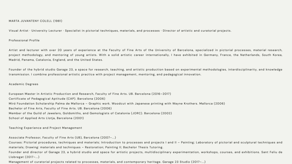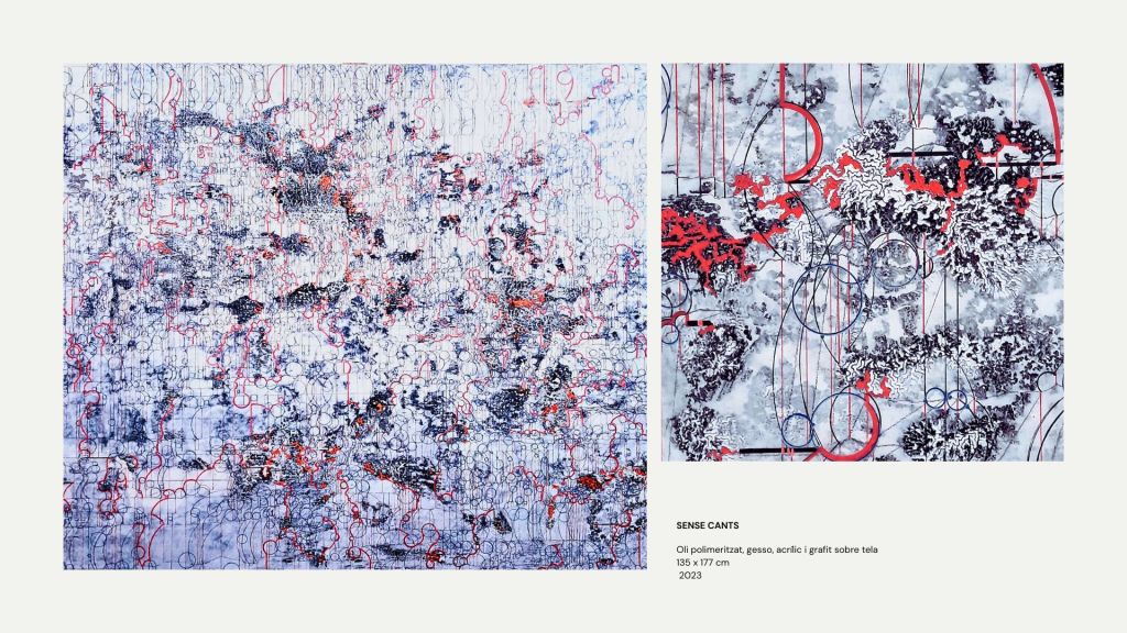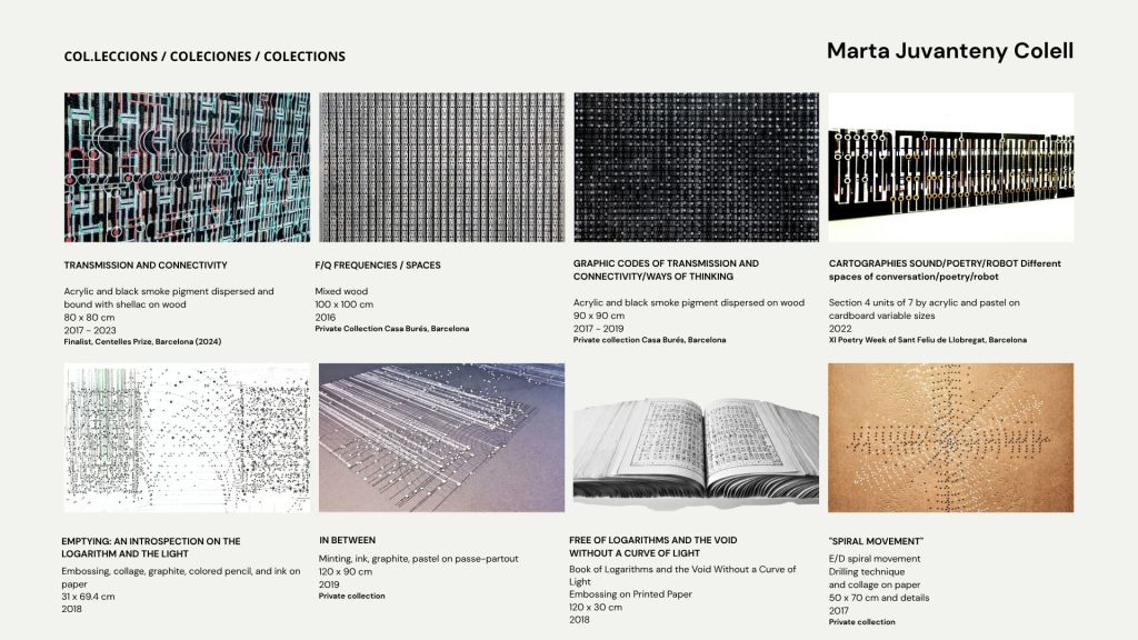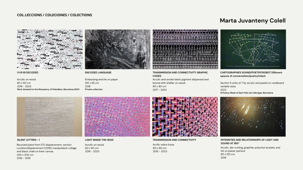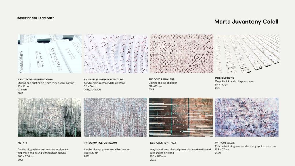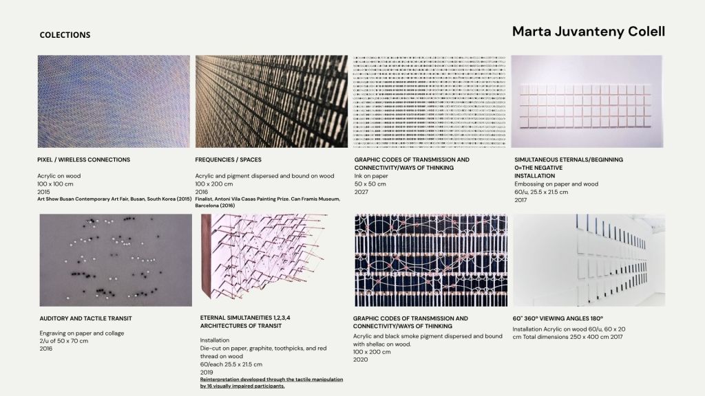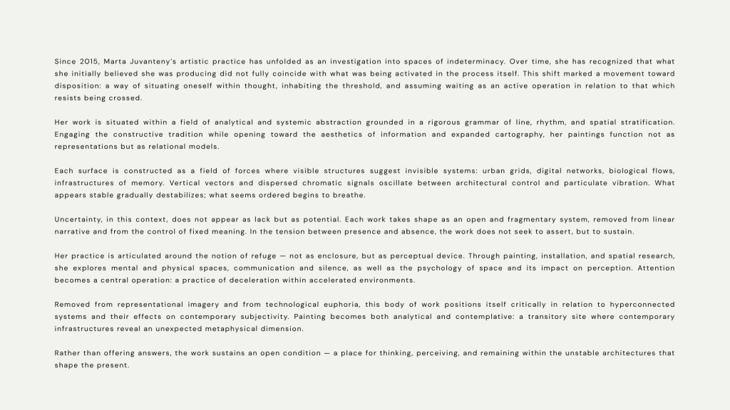 La práctica pictórica de Marta Juvanteny se sitúa claramente en una línea de abstracción analítica y sistémica. Se fundamenta en una gramática rigurosa de la línea, el ritmo y la estratificación espacial que dialoga con la tradición constructiva, al tiempo que se abre a una sensibilidad contemporánea vinculada a la estética de la información, la cartografía expandida y la visualización de datos entendida como metáfora poética.