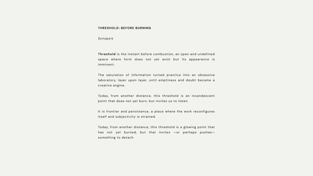 Este umbral es frontera y sospecha, un espacio de duda y persistencia, un lugar donde mi trabajo se reconfigura y yo me convierto en traza. Desde este borde, aún incandescente pero intacto, surge la necesidad de compartir.